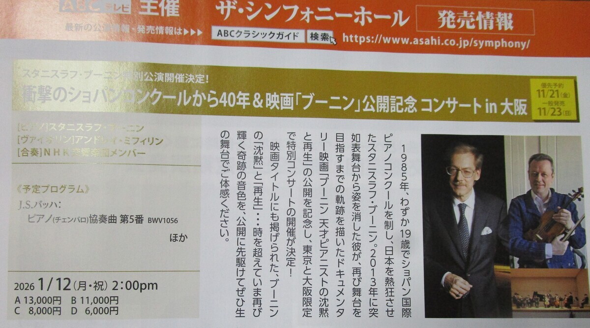 ◎さて、今年はスタニスラフ・ブーニンさんが19歳でショパンコンクールで優勝した年から40年です。そのブーニンさんの映画が公開されるそうです。2013年に突然姿を消してから再び演奏家として復帰するまでが映画になり、その映画公開記念のコンサートが大阪と東京であるそうです。昨日、庭の笹切りしていたらチケット優先予約日だったのを忘れてしまっていました。
