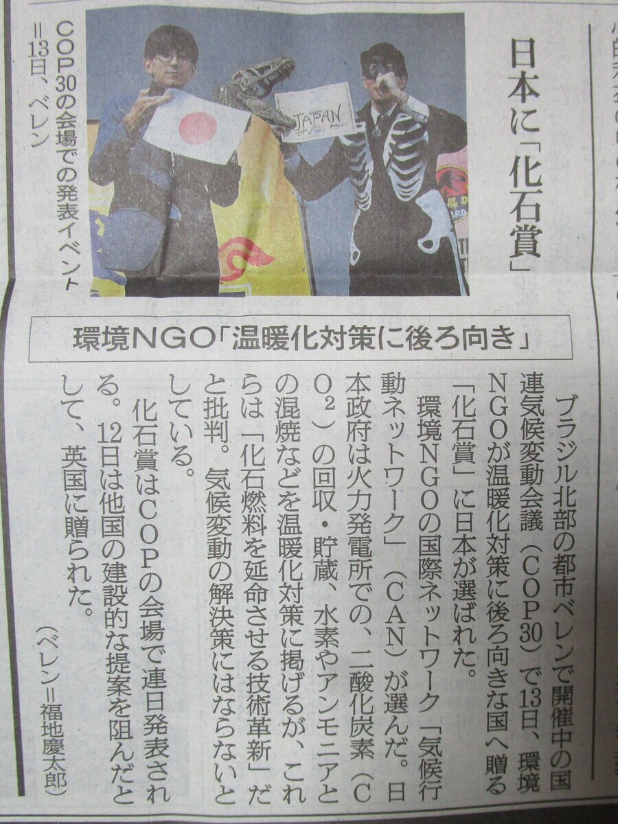 🔲温暖化対策後ろ向き日本に「化石賞」:
